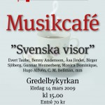Under februari månad jobbade vi med musik till vårt musikcafé. Samtidigt hade vi engagerat Gunnar Klum för att under ett par tisdagar ge alla möjlighet till en enskild lektion, samtidigt med ordinarie repetitioner. Musikcaféet gick av stapeln den 14 mars i Gredelbykyrkan, på temat ”svenska visor”. Repertoaren bestod av allt möjligt från Taube, och folkvisor, till Benny Andersson, mm. Konserten bestod även av framträdanden i mindre grupper, och med instrumentalinsatser av enskilda körmedlemmar.